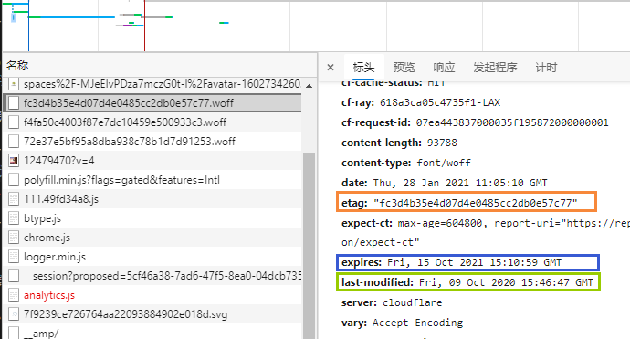 我们通过浏览器获取服务器远程资源时,服务器通过http请求response headers返回一个expires时间戳字段(上图中蓝色部分),例如expires: Wed, 13 Oct 2021 22:15:05 GMT,表明这个资源的过期时间为格林威治时间2021年10月13日 周三 22:15:05(北京时间+8h=格林威治时间),浏览器判断当前时间在资源过期时间之前的话,就会从缓存中去读取资源(如果缓存中存在的话),否则会重新向服务器发送请求。