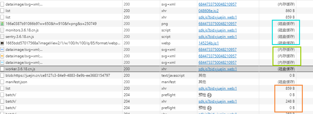图中青色、绿色和橙色圈出的部分分别是来自内存(memory缓存)、磁盘(disk缓存)和Http请求拿到的数据(非缓存),还有一种返回码304的请求也是从缓存(memory/disk)中获取数据。304跟memory/disk缓存的区别是:在浏览器判断资源已经过期的情况下会去服务器查询资源是否更新,如果资源没更新则返回304码,浏览器收到304码就会更新资源的过期时间并直接从之前disk/memory缓存中拿到当前资源,换言之如果资源没过期,那么浏览器就会跳过向服务器校验资源这一步并直接去拿memory/disk缓存获取。